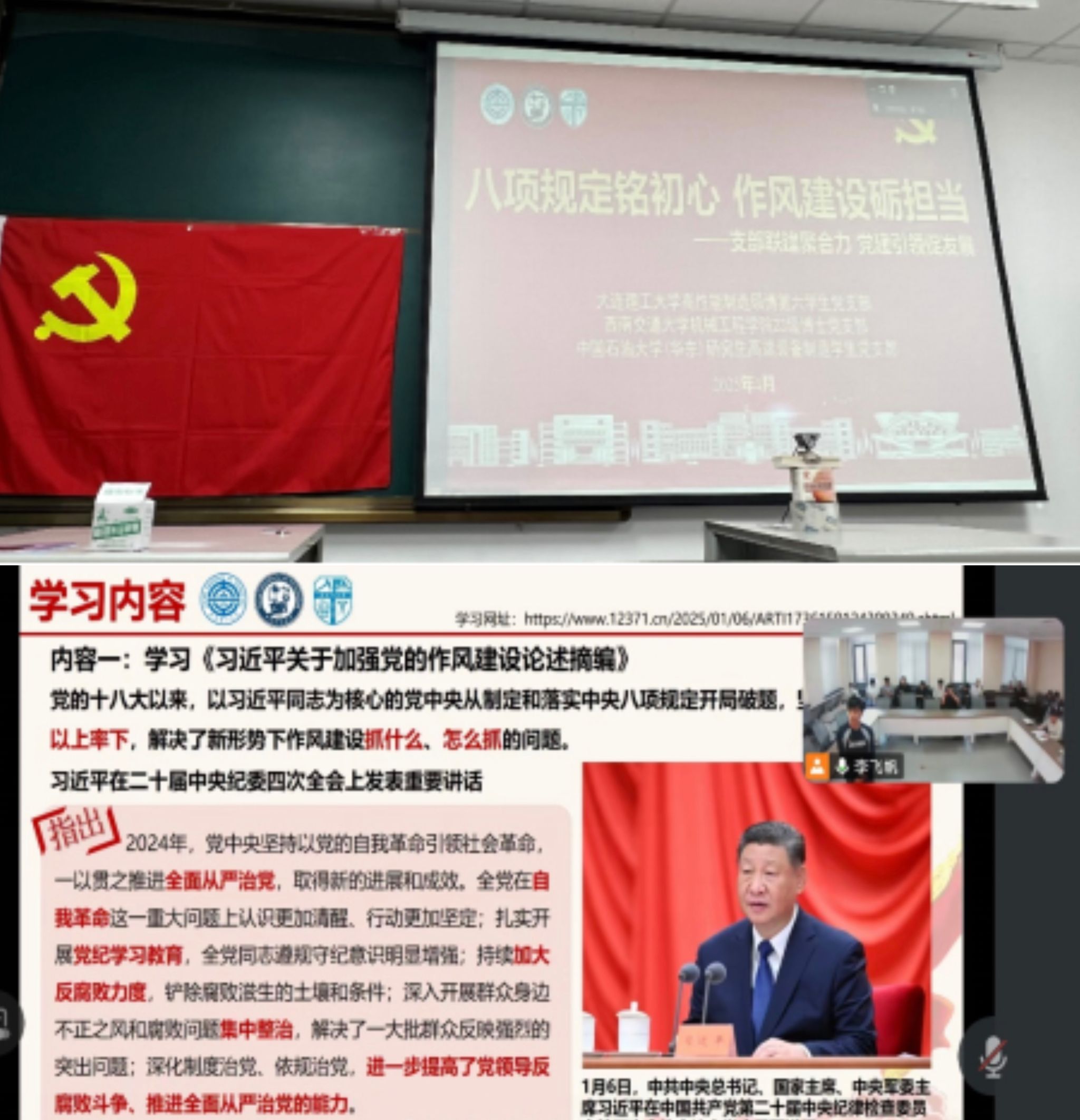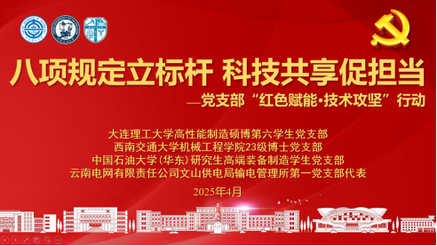 为深入推进党风廉政建设与科技创新深度融合,完美体育·(中国)官方网站23级博士党支部于2025年4月23日联合大连理工大学高性能制造硕博第六学生党支部、中国石油大学(华东)研究生高端装备制造学生党支部、云南电网有限责任公司文山供电局输电管理所第一党支部代表共同举办“八项规定立标杆,科技共享促担当”主题联建活动。活动以“作风建设筑根基、科技赋能促发展”为主线,通过专题报告、技术分享、互动研讨等形式,推动党员队伍在严守纪律规矩中激发创新活力,在服务发展大局中彰显责任担当。