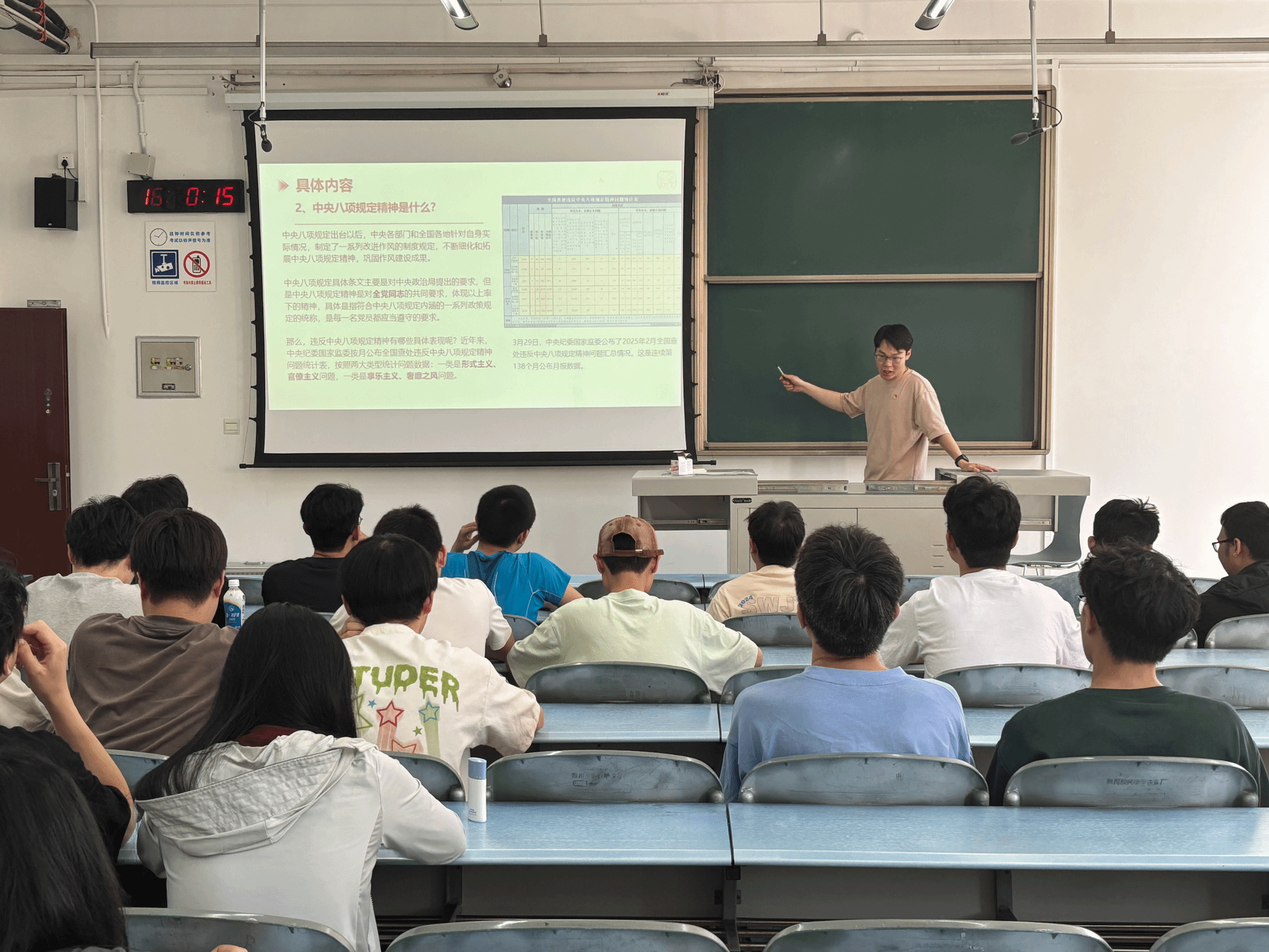 最后,张翔老师带领大家学习了习近平总书记关于作风建设的重要论述,向全体成员强调,中央八项规定绝非“一阵风”,而是全面从严治党的长期战略,是党保持先进性和纯洁性的重要保障。学生党员作为青年群体中的先进代表,更应以更高标准严格要求自己,将中央八项规定精神作为日常行为的“指南针”,不断增强纪律意识和规矩意识,在学习和生活中充分发挥先锋模范作用,以自身行动影响和带动身边同学。