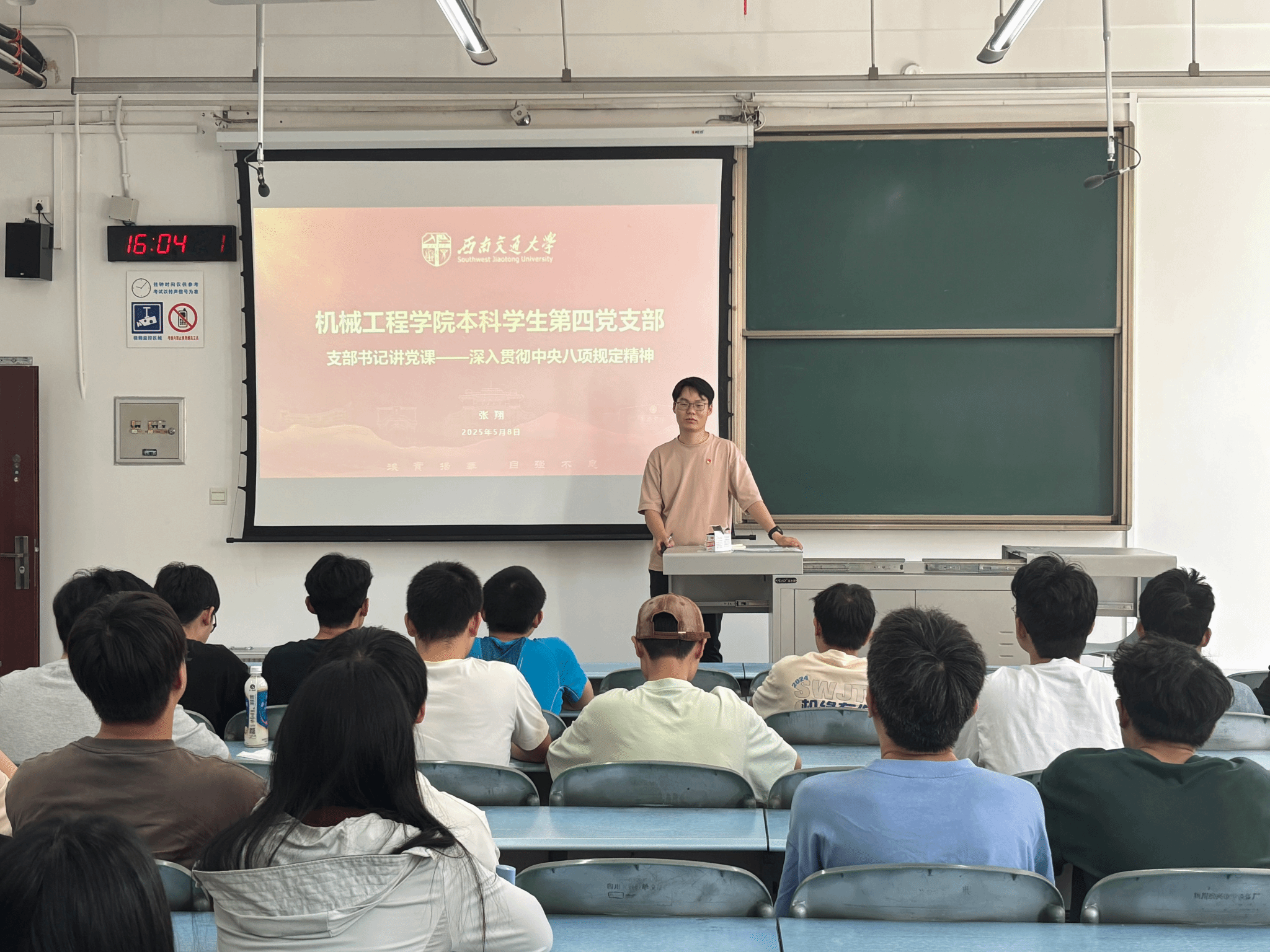 为深入学习贯彻习近平总书记关于加强党的作风建设的重要论述,扎实开展深入贯彻中央八项规定精神学习教育,推进作风建设常态化长效化,5月8日,本科学生第四党支部开展支部书记讲党课主题党日活动,支部书记张翔老师以“深入贯彻中央八项规定精神”为主题,为支部全体党员讲授了一堂作风建设党课。