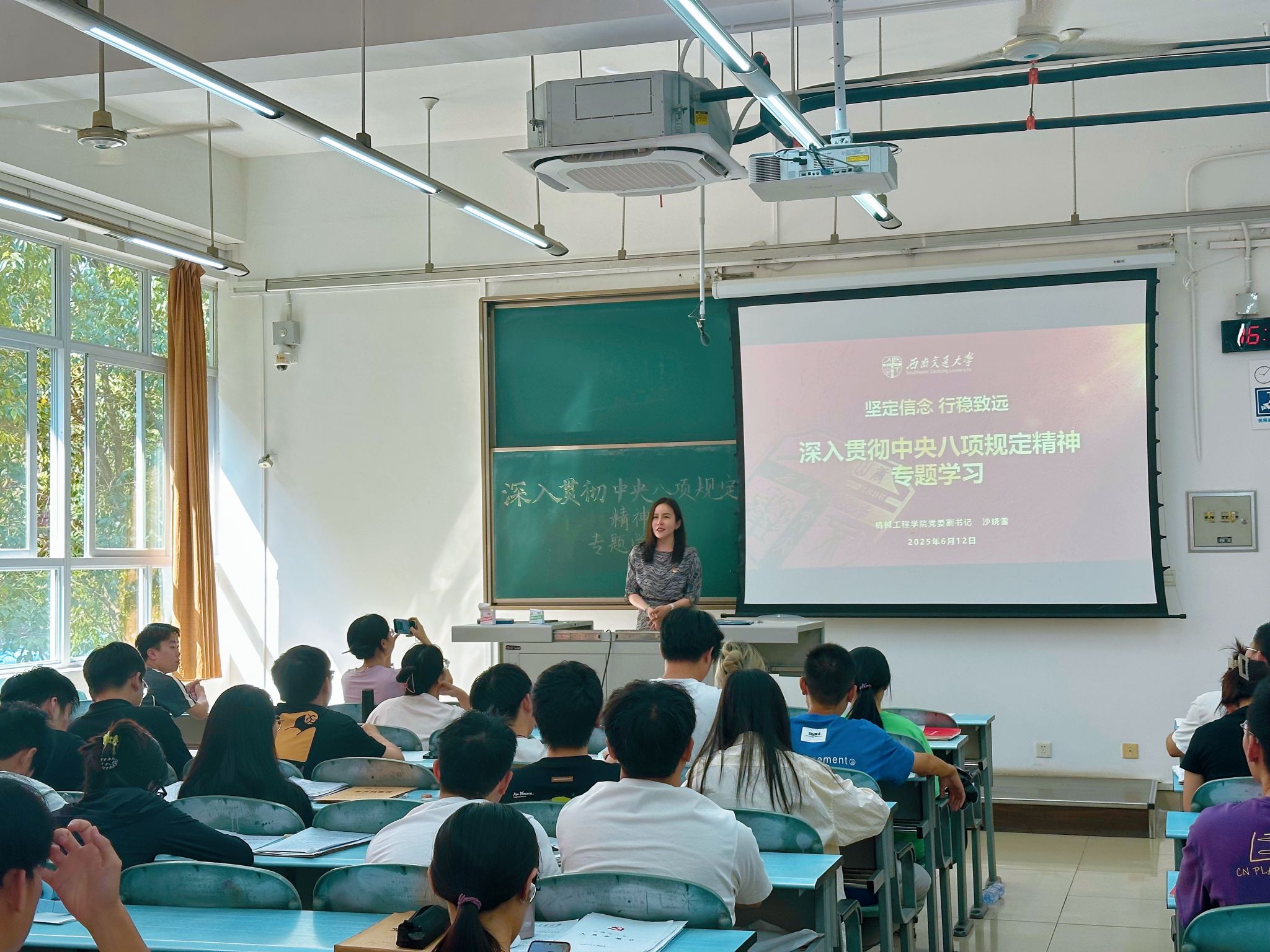 会议伊始,学院党委副书记沙晓雪以 “坚定信念,行稳致远 —— 深入贯彻中央八项规定精神” 为题讲授专题党课,从历史纵深阐释中央八项规定的出台背景与核心要义,结合 “数字化形式主义” 等典型案例警示 “小节失守” 的危害,以夏明翰、陈能宽等先烈的廉洁事迹号召党员 “筑牢思想防线,守住慎初慎微关口”。