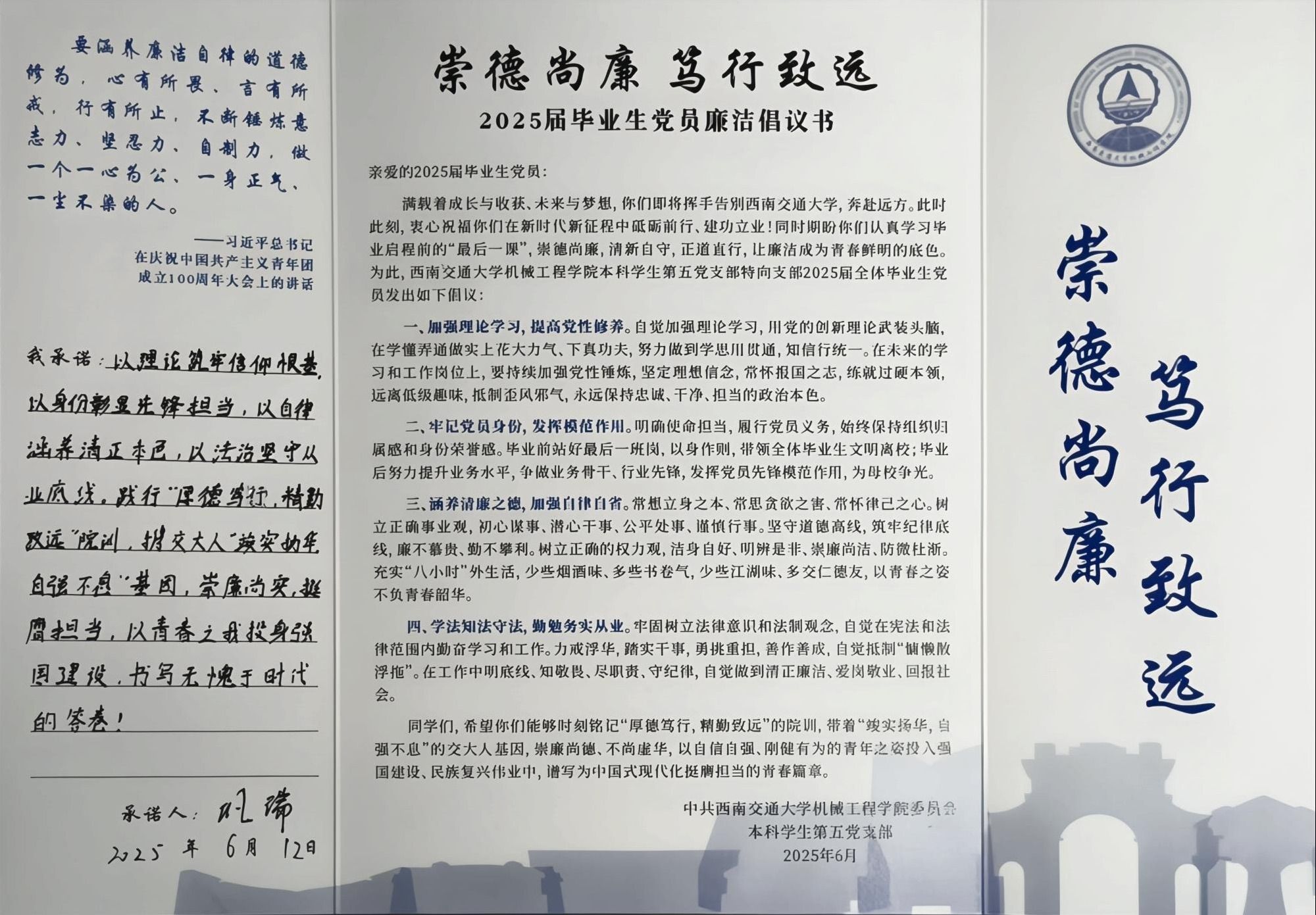 最后,在庄严氛围中,全体毕业生党员签署《廉洁承诺书》,以 “知敬畏、存戒惧、守底线” 的青春誓言,许下 “把廉洁作为青春鲜明底色” 的郑重承诺。