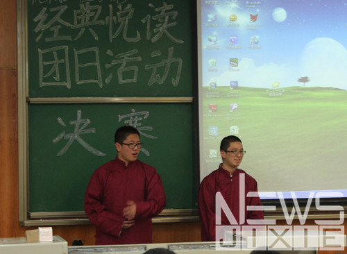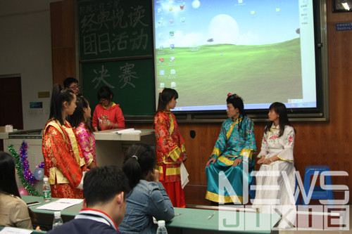 活动中最引人注目的是工业2012-1班,他们的参赛作品是《红楼梦》,表演开始,只见灯光一灭,红楼梦的主题曲在黑暗中响起,随着灯光点亮,一个个身着古装的女生便步态轻盈地走了进来,一看便知他们是有备而来的,接下来他们绘声绘色地表演了林黛玉进贾府与宝玉表真情的故事片段,其中宝玉的表现尤其出色,博得了台下阵阵掌声。表演结束,评委们也对他们的表现大加赞赏。