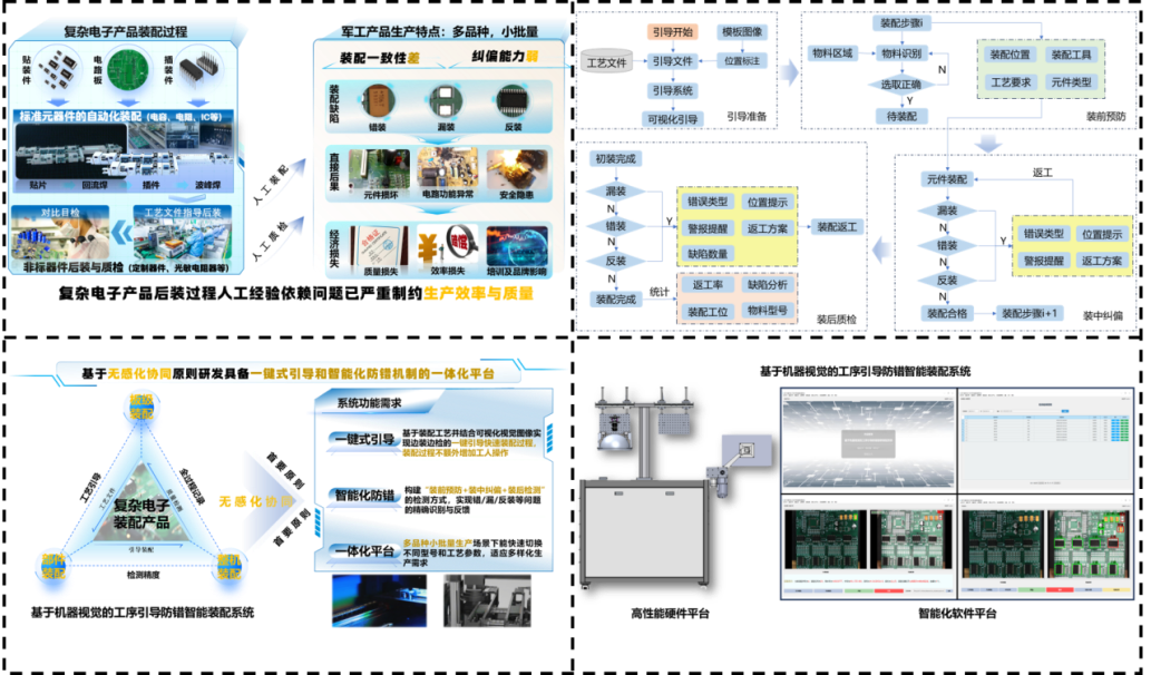 在新工科创新人才培养的背景下,完美体育·(中国)官方网站持续推进产教融合示范性项目,打造“基础研究-技术攻关-产业应用”的全链条创新生态,“引精智检-复杂装备电子产品装配质检一体化开拓者”是具有标志性意义的阶段化成果,该项目基于复杂电子产品人工后装与对比目检过程中,尤其针对“多品种,小批量”的特殊电子产品的生产,存在装配一致性差和纠偏能力弱以及严重制约生产效率与装配质量的问题,设计了一套基于无感化协同原则研发的具备一键式引导和智能化防错机制的一体化平台,该平台具有一键式引导装配、全过程智能化防错、引导质检一体化的特点,与传统引导方式相比,该项目研发的引导质检一体化平台避免了产品后装质量和效率严重依赖人工经验,是一套装配效率更高、防错机制更优、引导与质检兼具的一体化平台。
