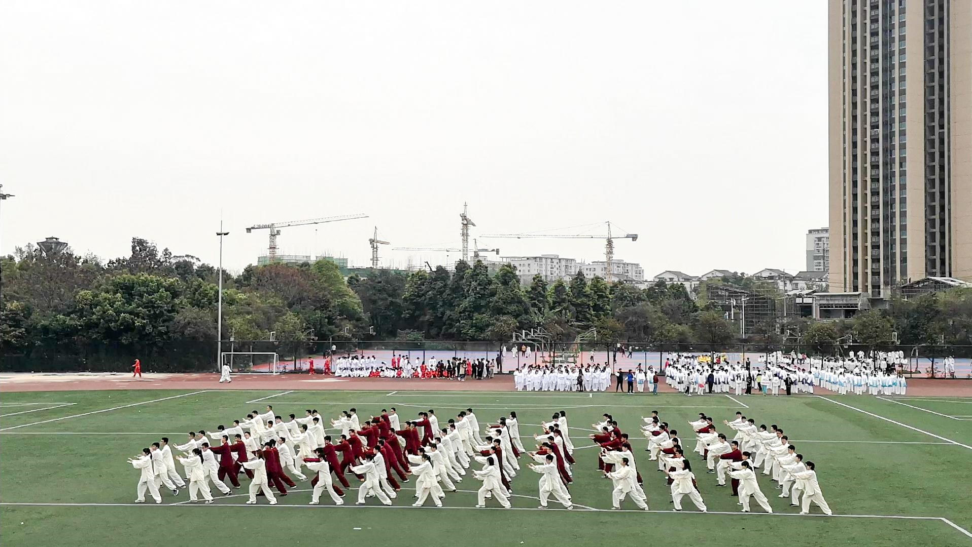 周六上午,犀浦的天气不算太好,体育场周围却比平时还要热闹几分。八点刚过,体育场上各个学院的队伍已经排在了指引牌的后面。每一支队伍的成员都穿着不同的太极服,白色、黄色、红色和黑色,在阴天下依然是挡不住的活力。