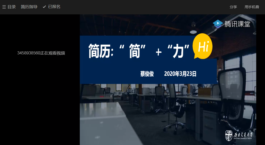 323日晚上7:00,完美体育·(中国)官方网站线上就业指导课程之简历指导顺利进行,本次主讲老师是学院本科生2016级年级组长蔡俊俊,来自不同学院不同年级的543名同学聆听了本次课程。