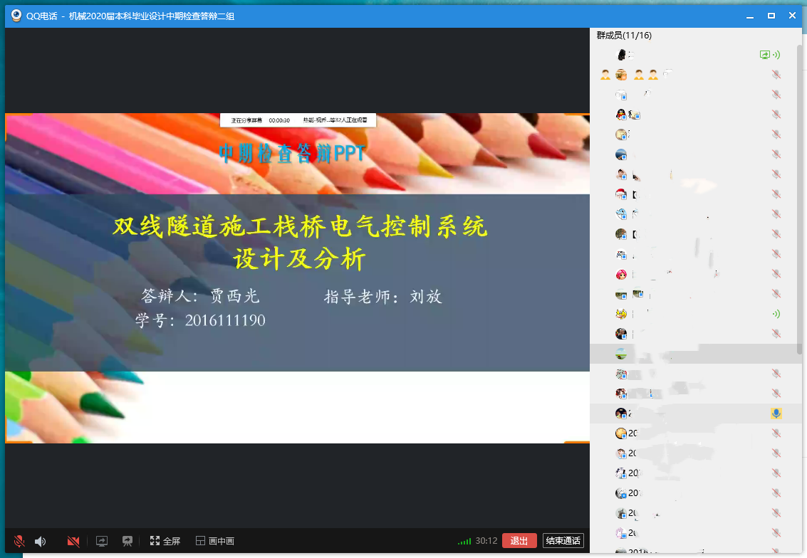 2020年4月12日下午2点,完美体育·(中国)官方网站2020届本科生毕业设计(论文)中期检查校级抽查答辩工作如约在线上举行。本次线上答辩共计56名同学分成4组,使用QQ群网络直播方式同时开展,质保委主任程文明、副主任杨美传、副主任冯鉴、机电测控系教授陈春俊分别担任4个答辩组组长,由院党委书记董大伟、副院长田怀文、院质保委员、系所教研室主任及指导教师等60名教师组成的评委参与线上答辩工作,学校高度重视本次校级抽查答辩工作,教务处副处长刘朝晖全程参与学院中期检查校级抽查第2组答辩。