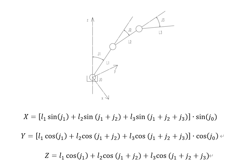 已知X、Y、Z和L1、L2、L3,要求j0、j1、j2、j3,即三个方程四个未知数,还需要一个条件才能求解出结果。求解有两种思路,一种就是遍历j1,求出所有可能解,再从中删选出理想的解;另一种就是给定一个杆的姿态。结合我的项目实际,我选择给定L3水平,即给定条件,就可以求解出四个角度值。