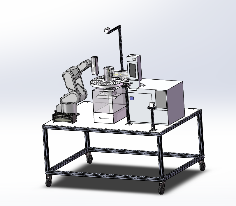 整个装置包括注射器抓手、色谱进样瓶抓手、自动化操作手、样品盘、视觉系统、机械臂、废弃盒、试管架和底部平台等多个部分,目前已经完成了119个零件的建模。其中较为关键的为注射器抓手、色谱进样瓶抓手、自动化操作手三个部分。