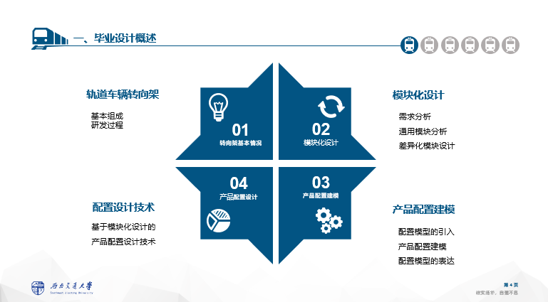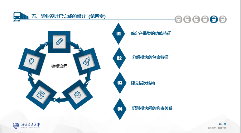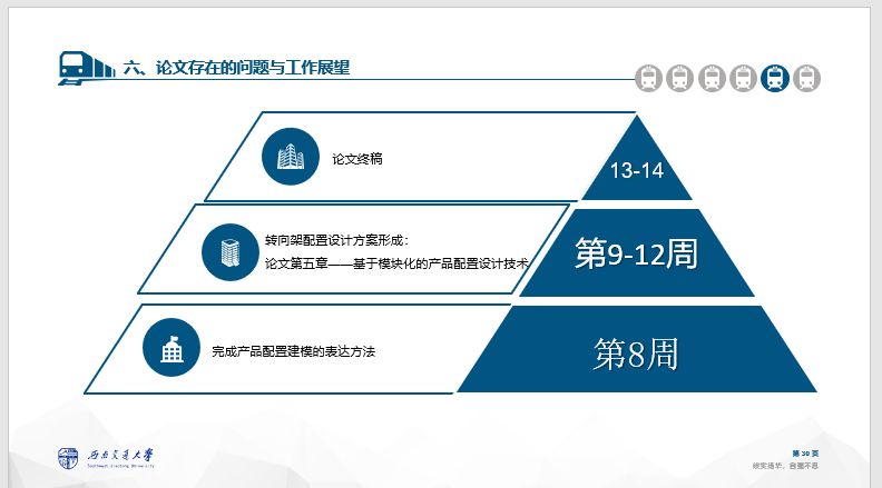 截止到中期答辩,我已经按照指导老师的要求完成相应任务,从开始熟悉对转向架组成及研发过程到需求分析、模块划分、配置建模、产品配置技术,确定了毕设的技术路线,并完成了相关内容的整理,以下为期中答辩ppt部分截图