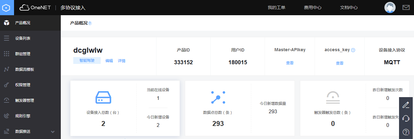 OneNET移动云产品状态界面