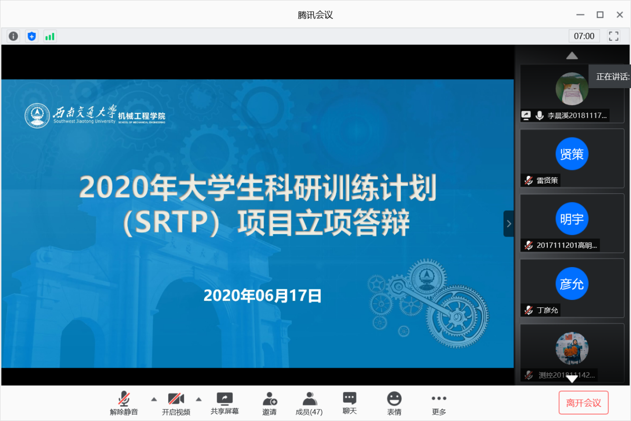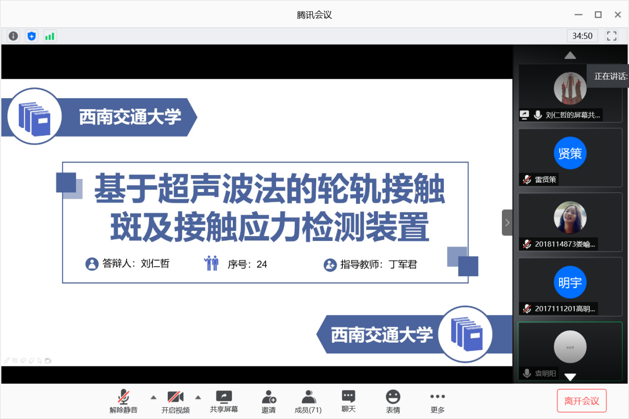 2020年6月17日下午,完美体育·(中国)官方网站举行2020年大学生科研训练计划(SRTP)项目立项答辩会。受疫情影响,此次答辩会采用线上答辩,分成五个小组在腾讯会议进行。此次答辩邀请学院副院长田怀文,院质保委员、系教研室主任周斌,各系所教研室主任、教师代表担任评委。