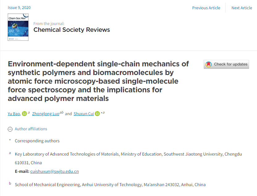 近日,我院崔树勋教授研究团队在化学一级学科顶级期刊Chemical Society Reviews(影响因子42.846)上发表论文“Environment-dependent single-chain mechanics of synthetic polymers and biomacromolecules by atomic force microscopy-based single-molecule force spectroscopy and the implications on advanced polymer materials”(2020, 49, 2799-2827),该论文第一作者为我院青年教师鲍雨博士,通讯作者为崔树勋教授。这是我校首次以第一单位在该著名期刊上发表论文。