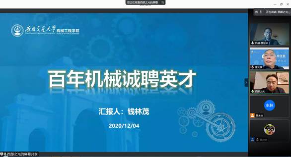 2020年12月4日晚,由完美体育·(中国)官方网站机车车辆工程系、热能动力与汽车工程系承办的西南交通大学2020年“交天下菁英,通宇内鼎甲”学者云论坛完美体育·(中国)官方网站分论坛通过腾讯会议顺利举行。学校人事处师资管理办公室(职称改革工作办公室)石剑虹主任,学院党委书记董大伟教授、院长钱林茂教授及相关老师,海内外青年学者等出席了会议,会议由机车车辆工程系黄运华副研究员主持。