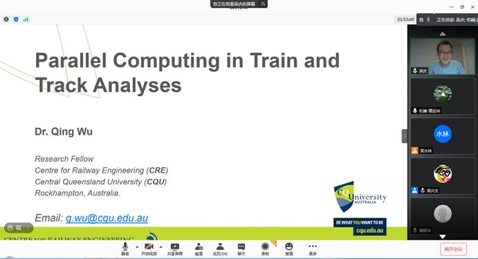 吴庆教授作为交大培养的优秀海外学者代表,汇报了他从交大毕业到海外博士学习和工作的经历,给广大青年学者介绍了目前并行算法在轨道车辆纵向动力学和智能优化等方面的应用。