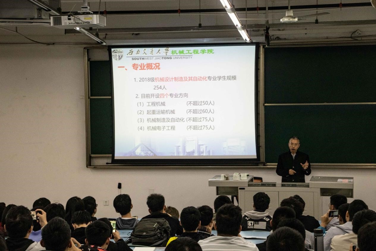 随后由机械设计制造及其自动化,交通设备与控制工程以及车辆工程专业的老师为大家介绍各自专业的不同方向。四川省教学名师李芾教授等老师依次走上讲台,为大家详尽介绍各方向的发展方向,发展历史,师资力量及方向优势,引导学生选择自己喜欢的、适合自己的专业方向。