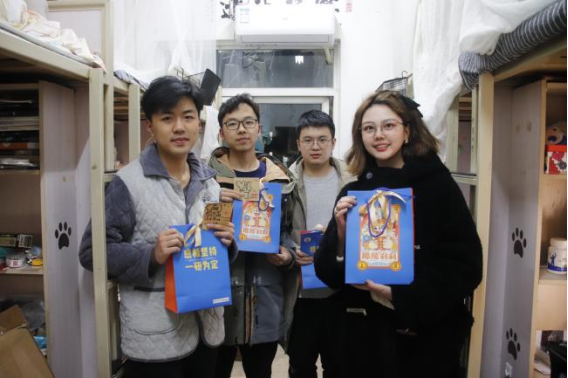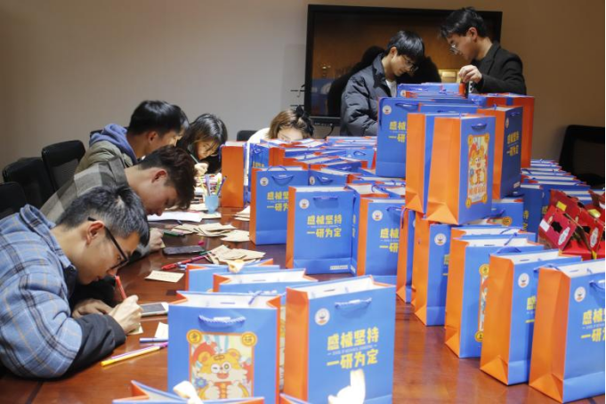本次送温暖活动中的“锦囊”由“成绩旺旺”旺仔牛奶,机械定制口罩、“上岸”袜、巧克力和辅导员手写的祝福便利贴组成。“上岸成功”“攻克难题”“力拔头筹”一双双定制袜子上是对考研学子简洁却有力量的祝福,也希望在寒冷的冬日给大家带来温暖;而巧克力可以给奋斗学习的大家带来一些能量,寓意巧用方法,攻克难题,力拔头筹;而辅导员的亲笔爱心便利贴上有各种手绘图案和祝福语,背面则是由2018级同学夏大为、张乐乐绘制的锦鲤——机械师生携手坚持,祝福大家成功上岸;印着老虎卡通形象“锦囊袋”由18级辅导员李曦绘制,交大蓝机械黄为主色调,画里老虎手中举着录取通知书,希望同学们在疲惫的枯燥的备考中,可以感受到学院的温情与关心。