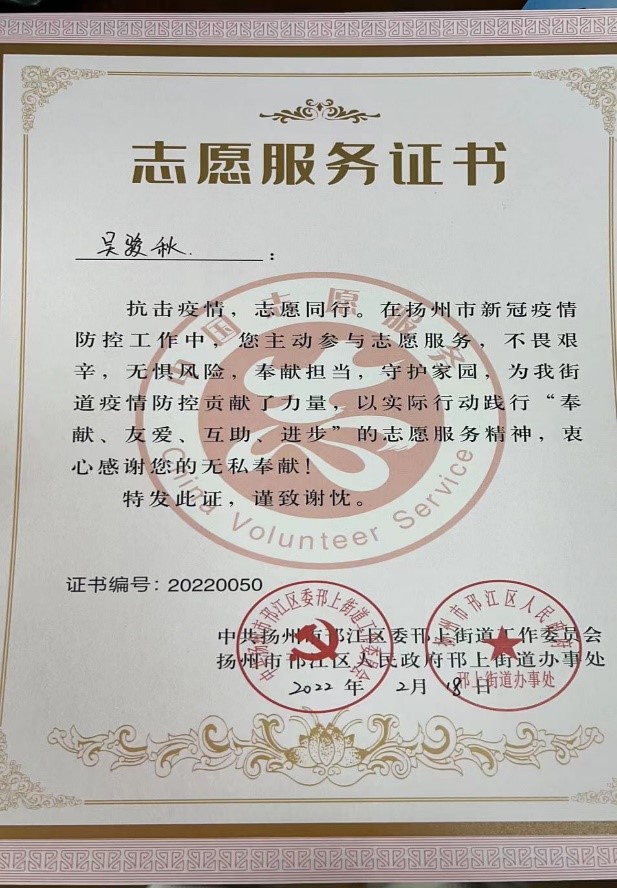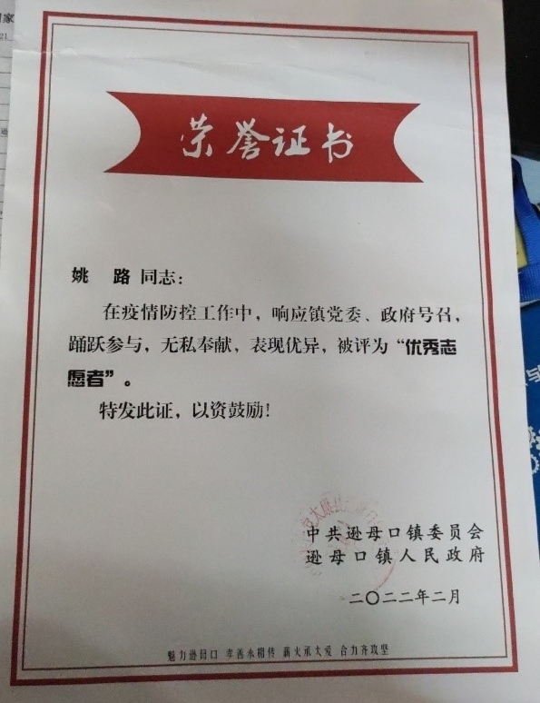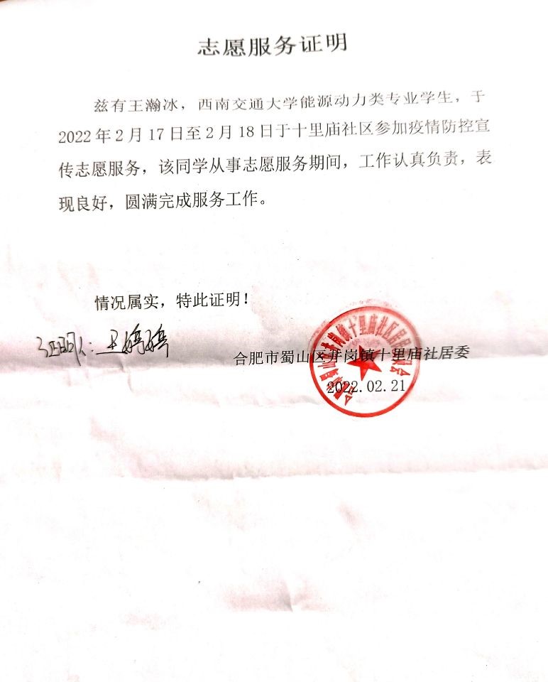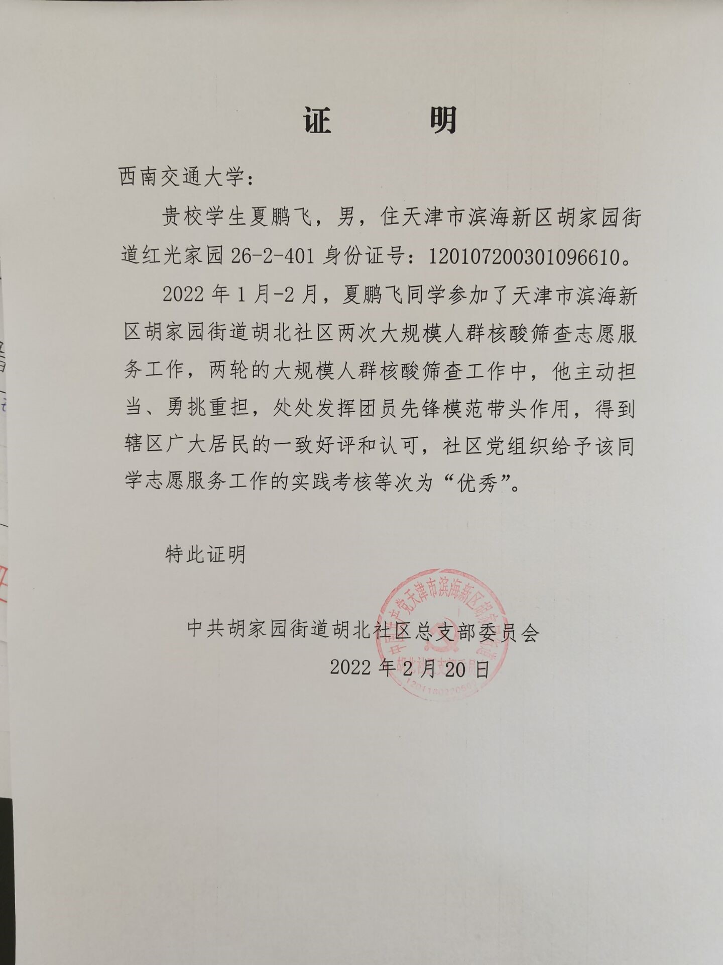 除此之外,来自能动类2021-04班的王瀚冰同学、能动类2021-04班的吴骏秋同学、机械类2021-01班的赵英杰同学、机械类2021-03班的姚路同学、车辆2021-06班的夏鹏飞同学第一时间也投入到“返家乡”社会实践活动中,为疫情防控、政务实践、社区建设等工作作出贡献。参加抗疫志愿活动的机械学子彰显了大学生积极进取,昂扬向上的精神风貌,展现了新青年的朝气活力与家国情怀。机械学子通过参加寒假防疫志愿活动,不仅提升了自我能力,获得了社会的认可,也为交大增添了光彩。完美体育·(中国)官方网站的青年志愿者们用热血汇聚磅礴力量,让团旗紧跟党旗,飘扬在抗疫一线,为打赢疫情阻击战贡献更多力量。