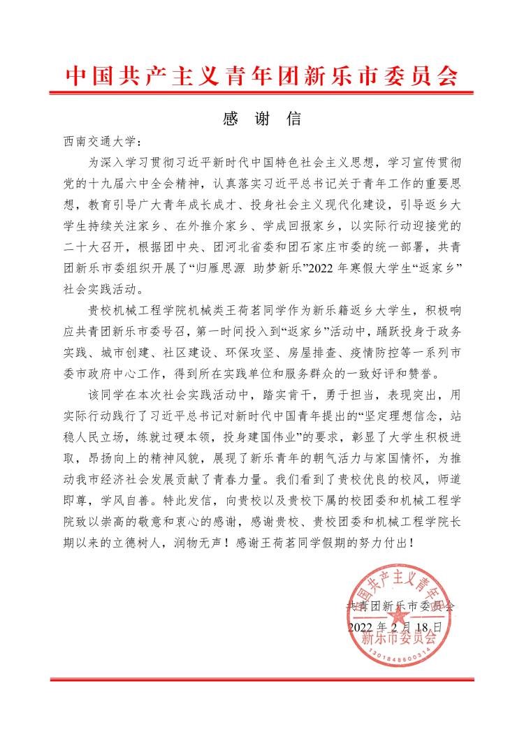 志愿服务圆满结束后,当地社区相关部门对交大机械学子的抗疫志愿服务行为表示高度评价。2月18日,共青团新乐市委员会发来感谢信,感谢王荷茗同学第一时间投入到志愿服务中。2月20日,唐山市丰润区火石营镇火西村村委会发来表扬信,表扬郭荣琪同学主动投身“战疫”线。1月26日,北京市鲁谷街道和黄庄职业高中对张子钰同学提出表扬。