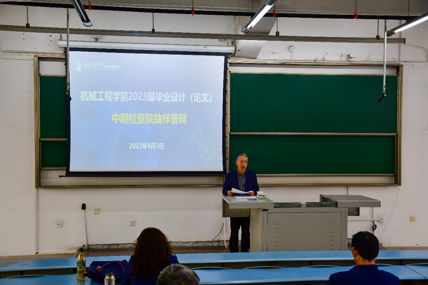 为加强2023届本科毕业设计(论文)过程管理和质量监控,根据学校2023届本科生毕业设计(论文)工作安排,学院于4月3日下午2点在犀浦X2321、X2336进行2023届本科生毕业设计中期院抽样答辩。学院副院长田怀文、本科教学质量保障委员会副主任杨美传、质保委员谢进、各系所主任及负责人担任答辩评委。本次答辩随机抽取了来自机械、工程、热能、测控、车辆、建环、交控各个专业的16名学生。