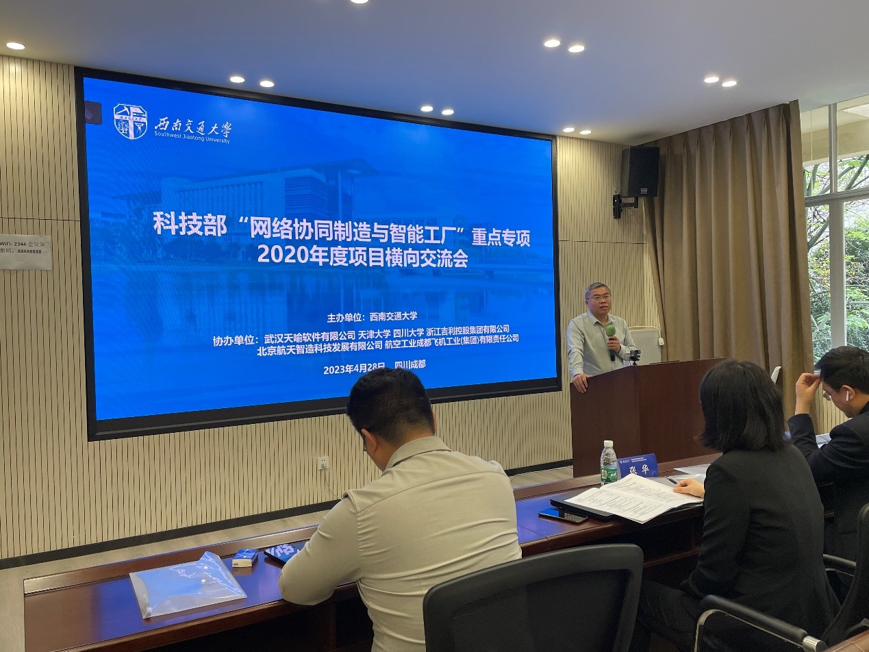 本次交流会由“1.5 面向产品全生命周期及闭环反馈的信息物理系统融合理论(2020YFB1708000)”项目负责人丁国富教授发起,共邀请同专项的4个项目参加,包括:“2.27 定制产品可视化智能设计与仿真验证关键技术及系统研发(2020YFB1711400)”、“2.31 规模化制造业多价值链协同云服务平台研发(2020YFB1711800)”、“2.35 基于工业互联的网络协同制造集成技术与平台研发(2020YFB1712200)”以及“3.1 面向航空航天产品制造过程的协同管控平台研发(2020YFB1712500)”。本次会议由西南交通大学主办,武汉天喻软件有限公司、天津大学、浙江吉利控股集团有限公司、四川大学、北京航天智造科技发展有限公司、航空工业成都飞机工业(集团)有限责任公司以及其它项目参研单位共60余人通过线下、线上共同参与了此次交流会议。