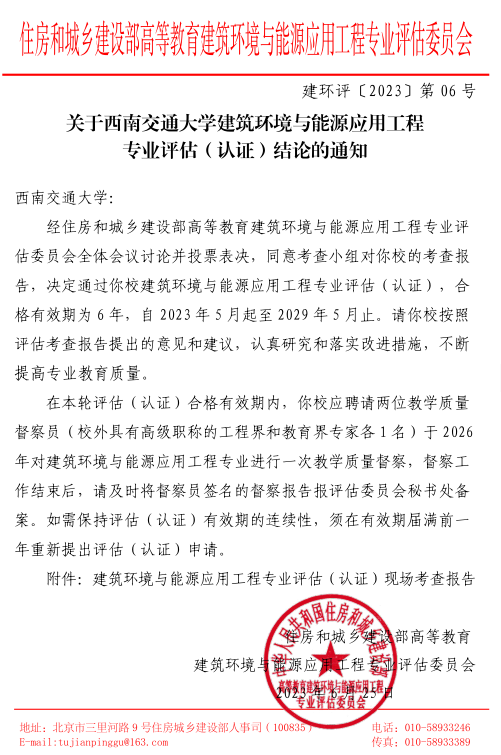 近日,住房和城乡建设部高等教育建筑环境与能源应用工程专业评估委员会正式下发《关于西南交通大学建筑环境与能源应用工程专业评估(认证)结论的通知》(建环评﹝2023﹞第06号),经住房和城乡建设部高等教育建筑环境与能源应用工程专业评估委员会全体会议讨论并投票表决,决定通过我校建筑环境与能源应用工程专业评估(认证),合格有效期为6年,自2023年5月起至2029年5月止。