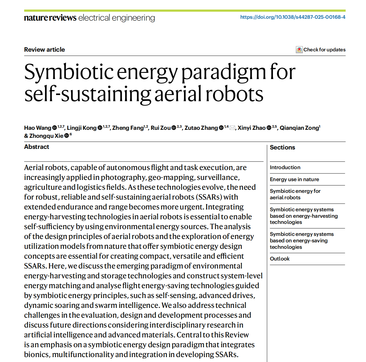 引文信息:Wang, H., Kong, L., Zhang, Z. et al. Symbiotic energy paradigm for self-sustaining aerial robots. Nat Rev Electr Eng (2025).