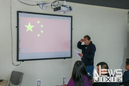 活动伊始,新疆维吾尔自治区教育厅内地新疆学生工作办公室的内派老师艾尼瓦尔握着右拳向国旗庄严宣誓,给大家树立了一个忠党爱党、忠国爱国的榜样形象。