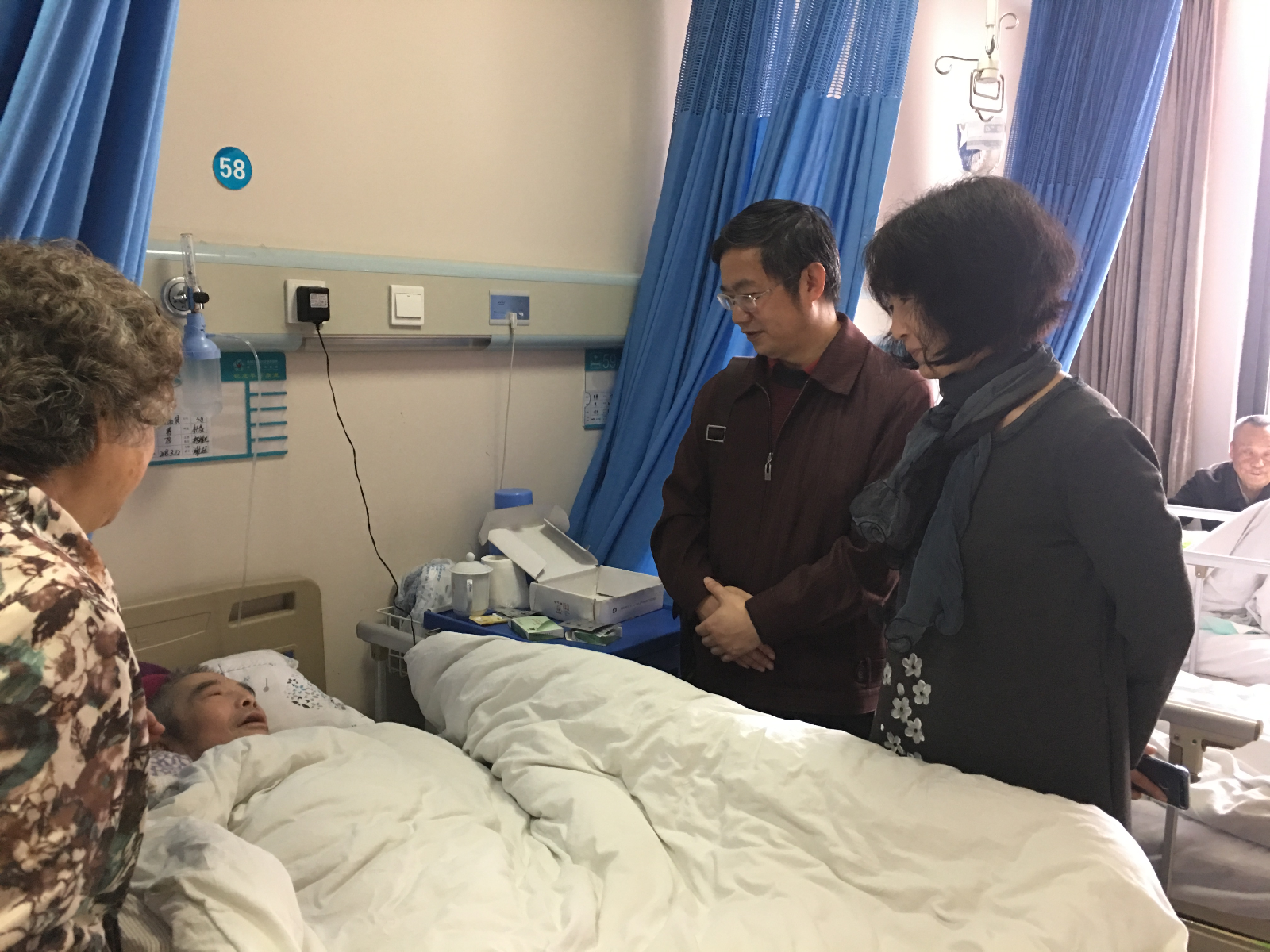 在医院病房内,战凤书记首先代表周仲荣院长及学院全体教职工向高品贤教授表示慰问,战书记与病人及家属亲切交谈,详细询问高品贤教授病情和治疗情况,关切地鼓励他们要树立信心,积极配合医院的治疗,安心养病,争取早日康复,并送上慰问品。高品贤教授及其家属表示深刻地感受到学院对他们的关爱,并再三感谢在住院期间学院领导及学院工会领导多次的关心和帮助。