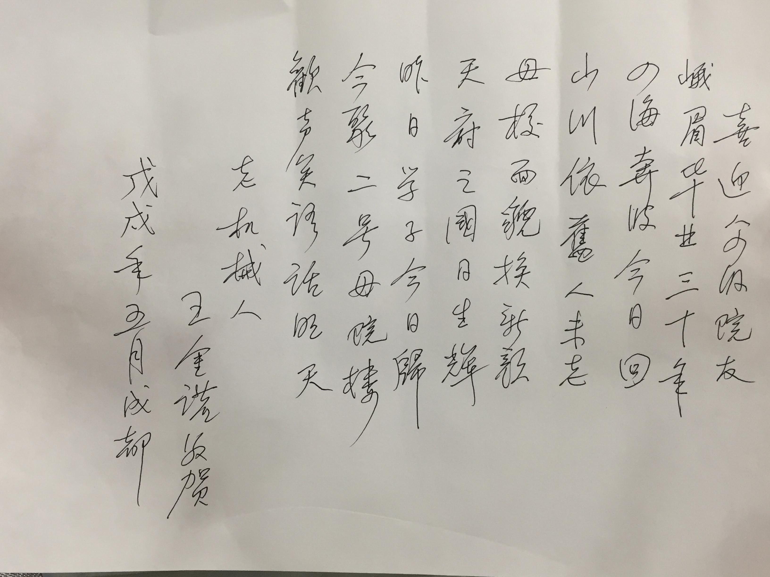 师生见面会,当然少不了老师对同学们嘱托,学院首任院长王金诺教授作为教师代表发表讲话。他表示能够见到84级的学生他非常高兴,希望在座的师生能给我们学院多提宝贵建议,让我们机械学科更上一层楼。会上,王金诺教授即兴作诗一首送给学院88届校友:“喜迎八四级院友,峨眉毕业三十年,四海奔波今日回,山川依旧人未老,母校面貌换新颜,天府之国日生辉,昨日学子今日归,今聚二号母院楼,欢声笑语话明天。——老机械人王金诺敬贺”。