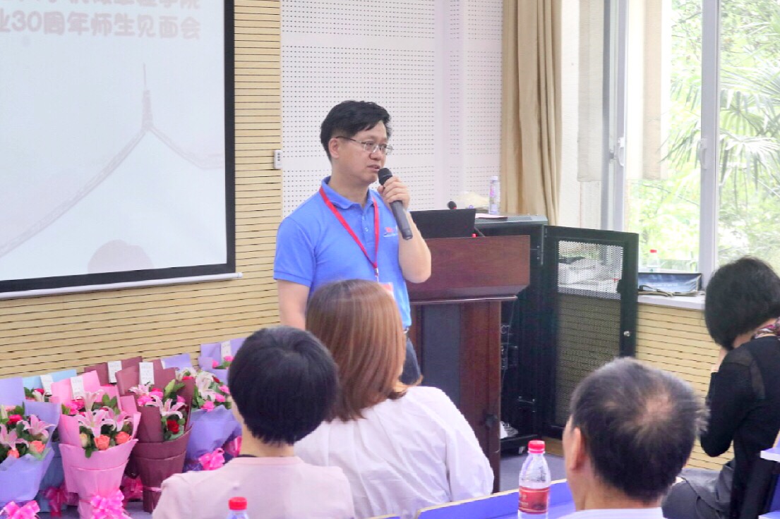 一阵掌声过后,校友代表纷纷向老师鲜花、与老师们合影,感谢老师们当年的教导培育之恩。校友代表万世祥发表了真切讲话,他讲到,老师当年的谆谆教导,至今还在耳边回荡,当年,老师不仅教我们知识技能,也教我们如何做人。三十年过去了,我们取得了一些成绩,也有了自己的家庭,非常感谢母校和老师的教导。看到学校人才辈出,让我们感到非常自豪,也感觉到了压力,今后将在工作岗位上努力拼搏、积极奋进,不辜负老师们的教导,为母校、母院争光。同时,他也对学院组织此次返校师生见面会表示了感谢,并祝愿老师们身体健康,同学们工作顺利。