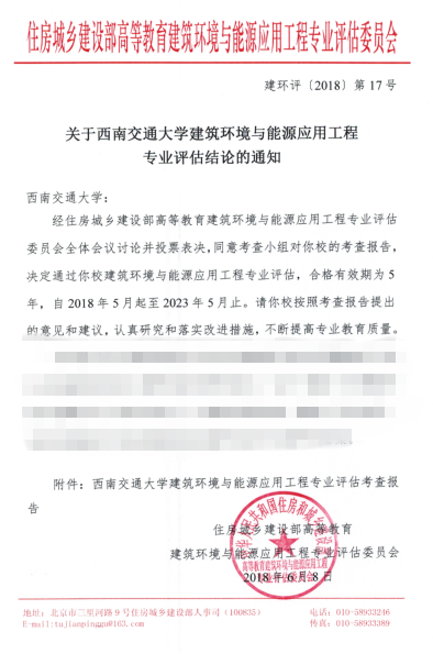 近日,住建部传来重大喜讯,住房城乡建设部高等教育建筑环境与能源应用工程专业评估委员会公布了《关于西南交通大学建筑环境与能源应用工程专业评估结论的通知》(建环评2018第17号),学院建筑环境与能源应用工程专业通过评估,合格有效期为5年,自2018年5月起至2023年5月止。这是建筑环境与能源应用工程专业第二次通过专业评估,对学院建环专业人才培养与国际接轨、提升专业教育质量和专业影响力具有重要意义。