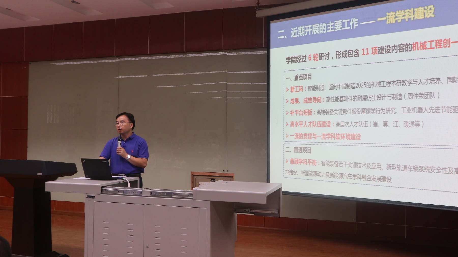 随后,钱林茂院长对上学期工作做了总结,并部署了本学期重点工作。钱院长指出,学院的一流学科建设工作经过六轮研讨,形成包含十一项建设内容的机械工程创一流建设方案,而高层次人才工作也有了新突破;新学期学院将以学校“十四次党代会”精神为指引,围绕学校创建“交通特色鲜明的综合性研究型一流大学”和“轨道交通领域世界第一的大学”的战略目标,全面创建学习型、服务型、创新型一流学院;同时对包括一流学科建设、人才工作、综合改革、100周年院庆等近期重点工作做了部署。他强调指出希望通过100周年院庆活动,突出学术院庆、文化院庆特色,做好人才引进和筹资等工作,借助社会媒体,加强院庆宣传,努力扩大学院影响力。学院各分管院领导,分别就各自分管工作,对上学期工作总结和本学期工作要点做了汇报。