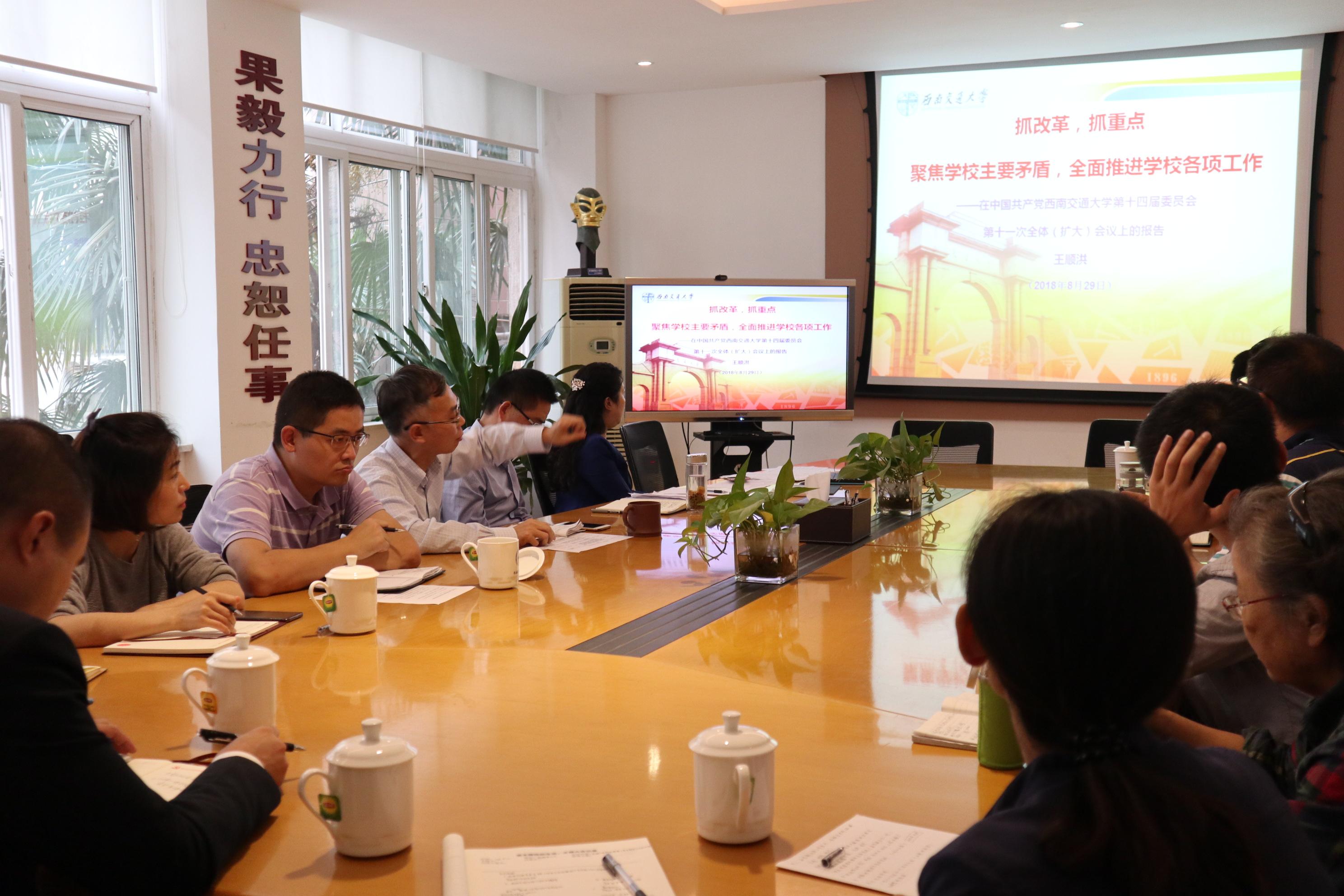 最后,董大伟书记传达了中共西南交通大学十四届十一次全体(扩大)会议精神并做总结讲话,董书记强调指出,学院本学期将聚焦学校面临的两个主要矛盾,即“国家‘交通强国’、教育强国’与‘一带一路’倡议对大交通人才和科技的需求与我校的有效供给不足的矛盾”与“师生和校友对美好生活的追求与学校给予的有效帮助不足的矛盾”,重点落实好五项工作:具体包括:党建、文化建设百年校庆;全面一流学科建设;成峨一体化和综合体制改革;全面加强人才引进与培养;大力推进科研工作。希望教职工党支部充分发挥好党支部的战斗堡垒作用和党员的先锋模范作用,为学院的改革和发展努力奉献。
