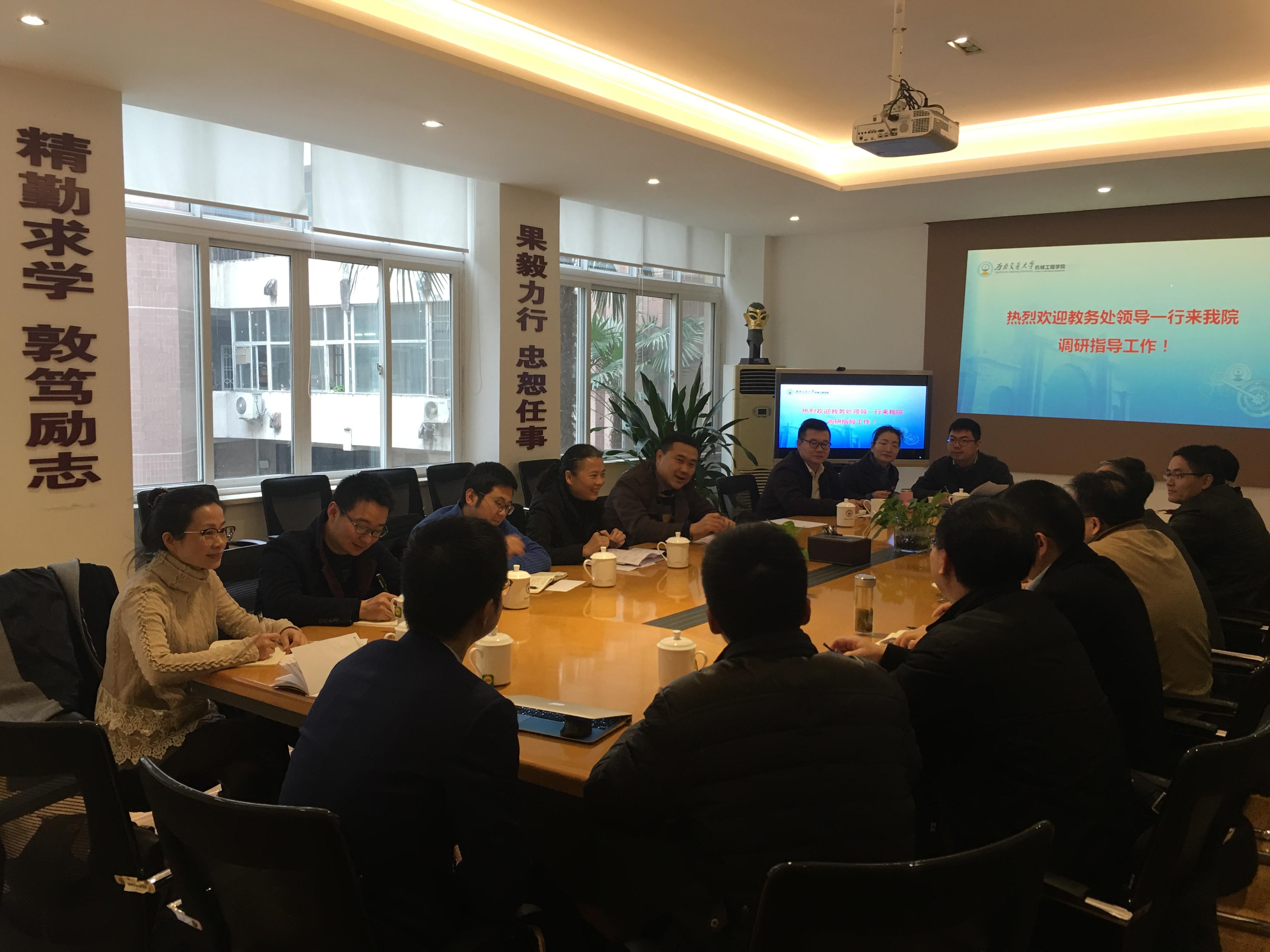 2018年11月30日,教务处处长崔凯、副处长刘朝晖、副处长毕凌岚及各科室负责同志一行10人赴学院进行本科教学工作调研。上午9时,调研座谈会在机械馆2206举行,学院党委书记董大伟、院长钱林茂及党政领导班子全体成员、各系所教研室主任参加座谈会。