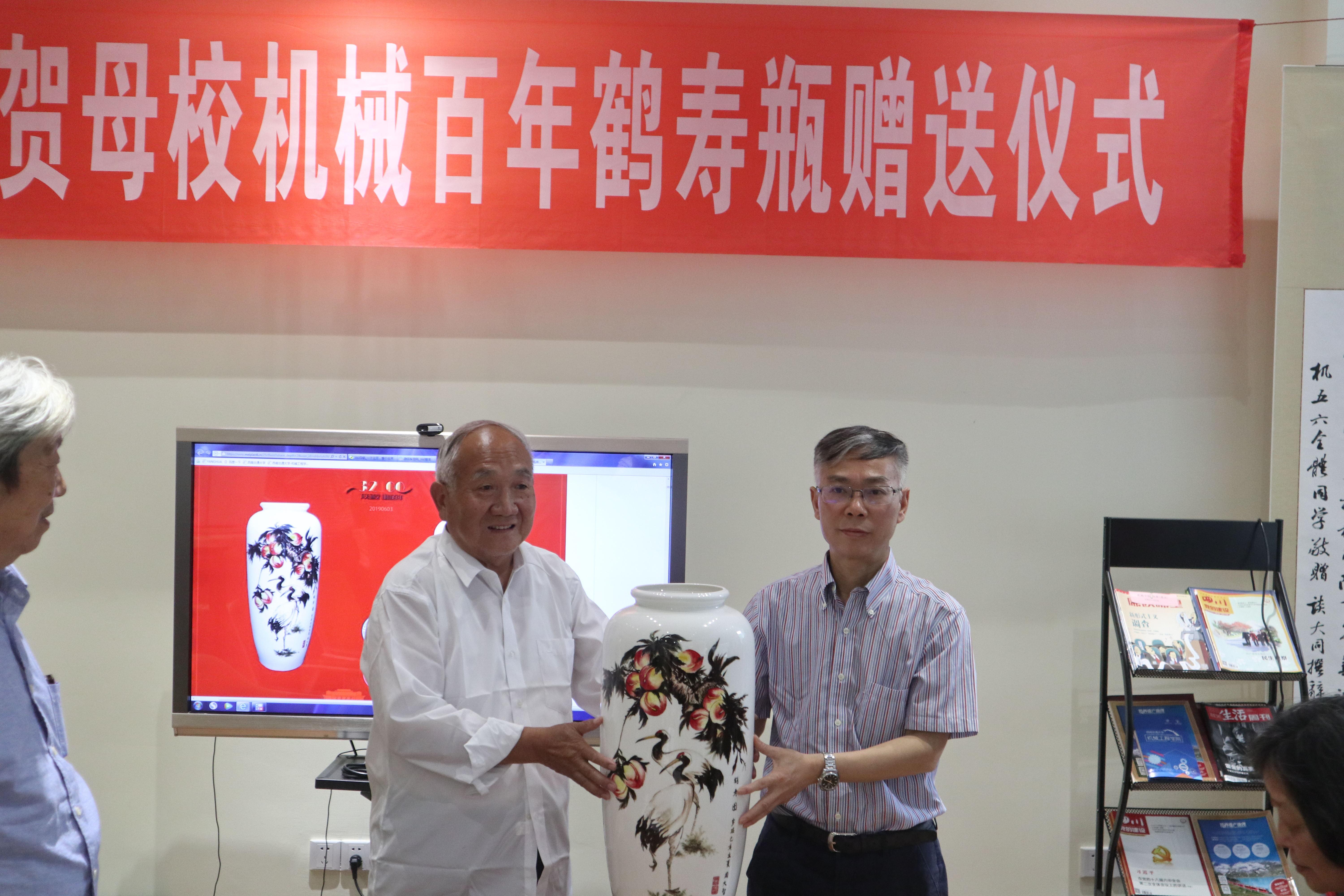 随后,校友代表详细介绍了蟠桃贺寿瓶及其由来。为庆贺母校机械学科创建一百周年诞辰,唐院校友微信群内的一百四十多位校友决定为母校献礼。蟠桃贺寿瓶由63届校友贾鸿光负责总设计,其上贺寿图由63届校友周大智创作,在唐山陶瓷研究所煅烧5遍,历经30天而成。制作材料用唐山水,唐山土,制作过程中请唐山师傅,用唐山手艺,代表了唐院校友对母校浓厚的感情。