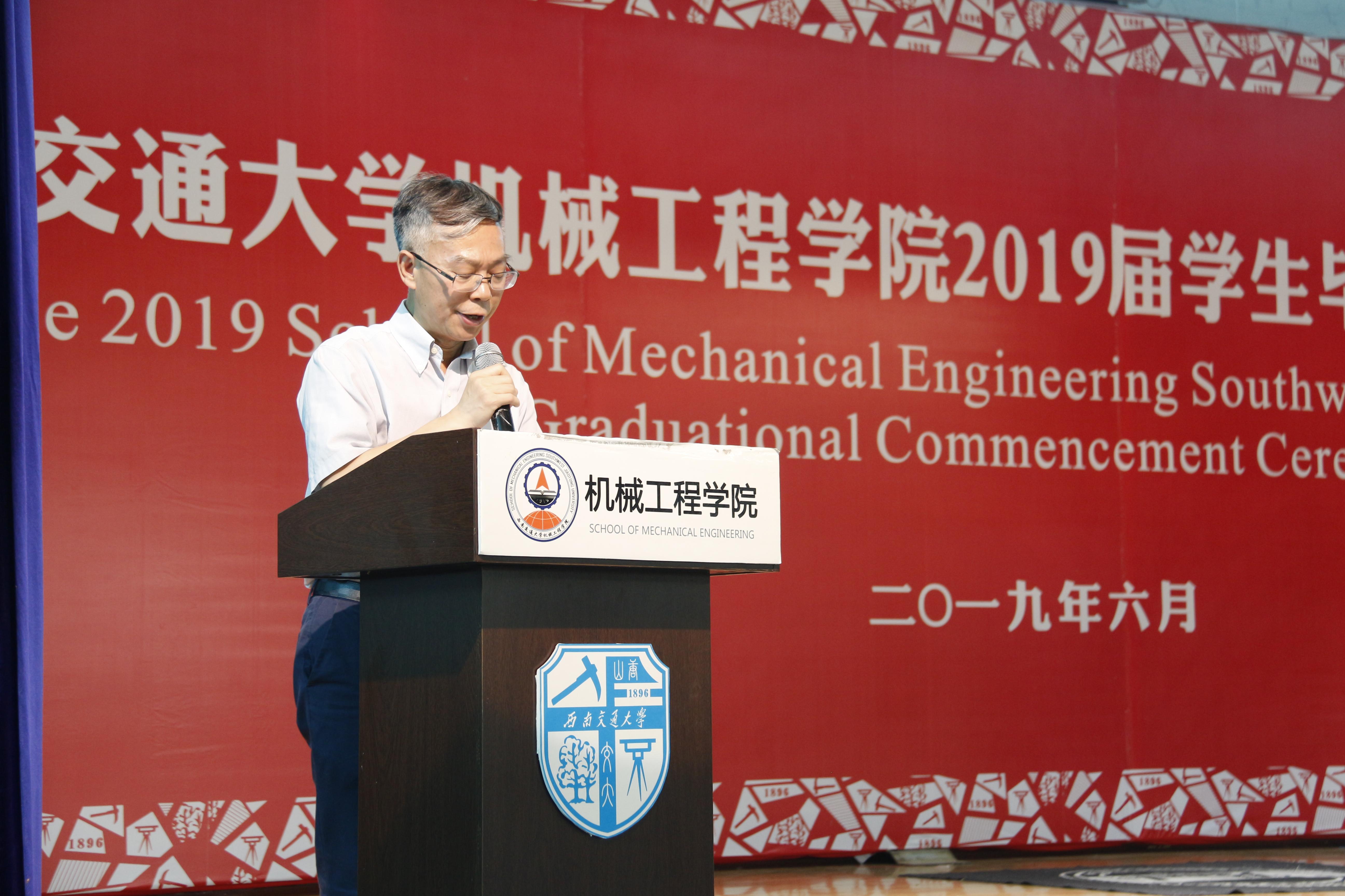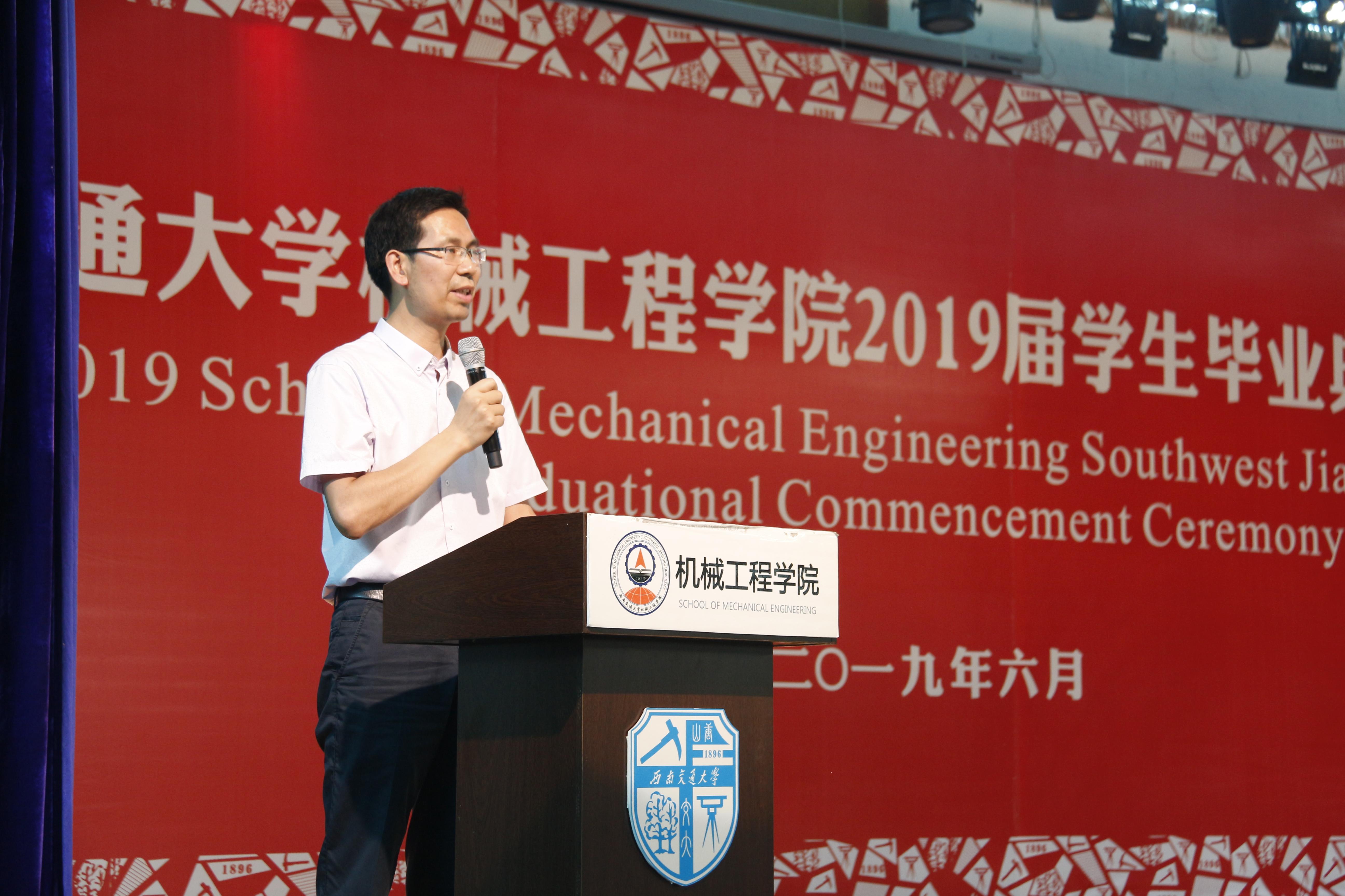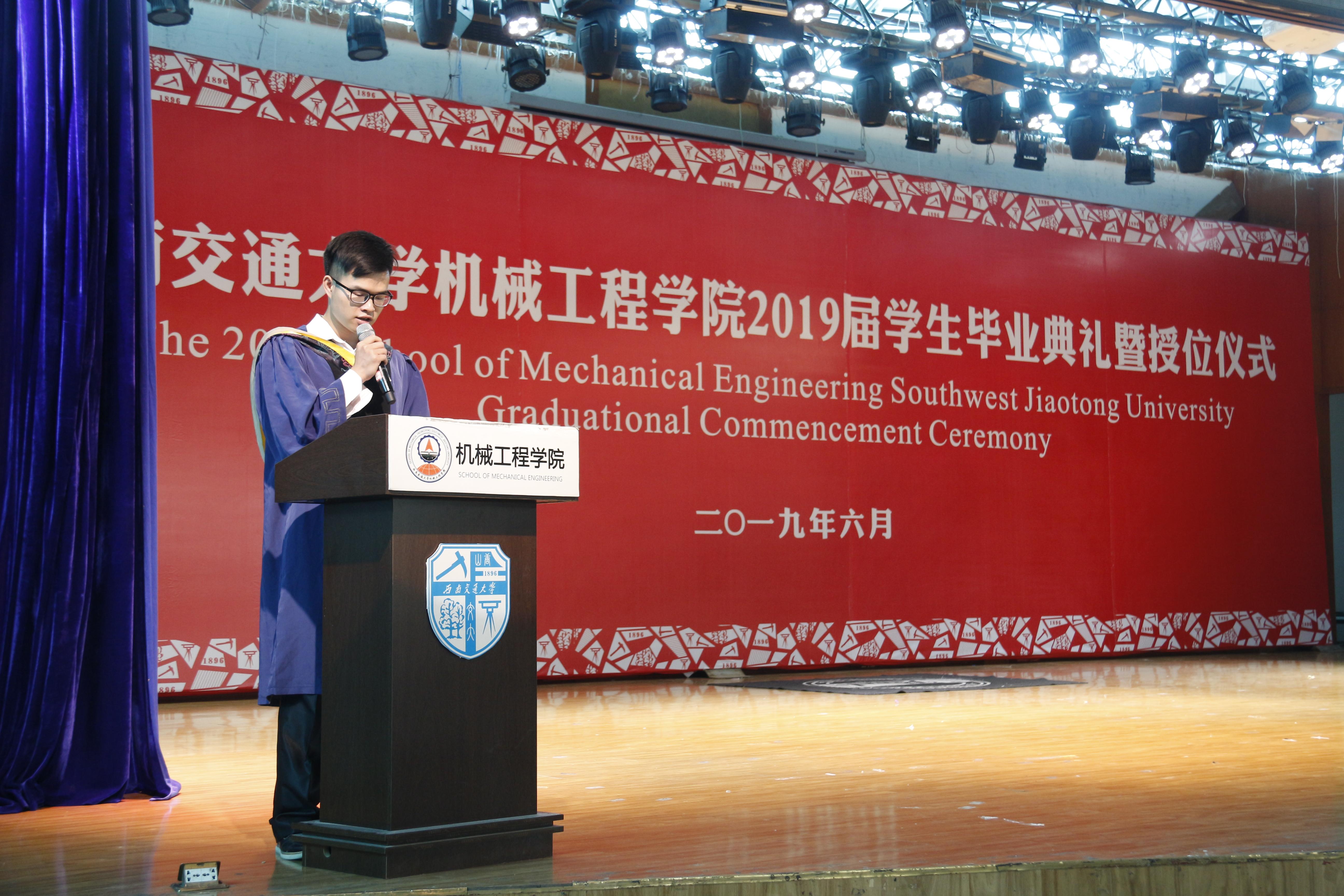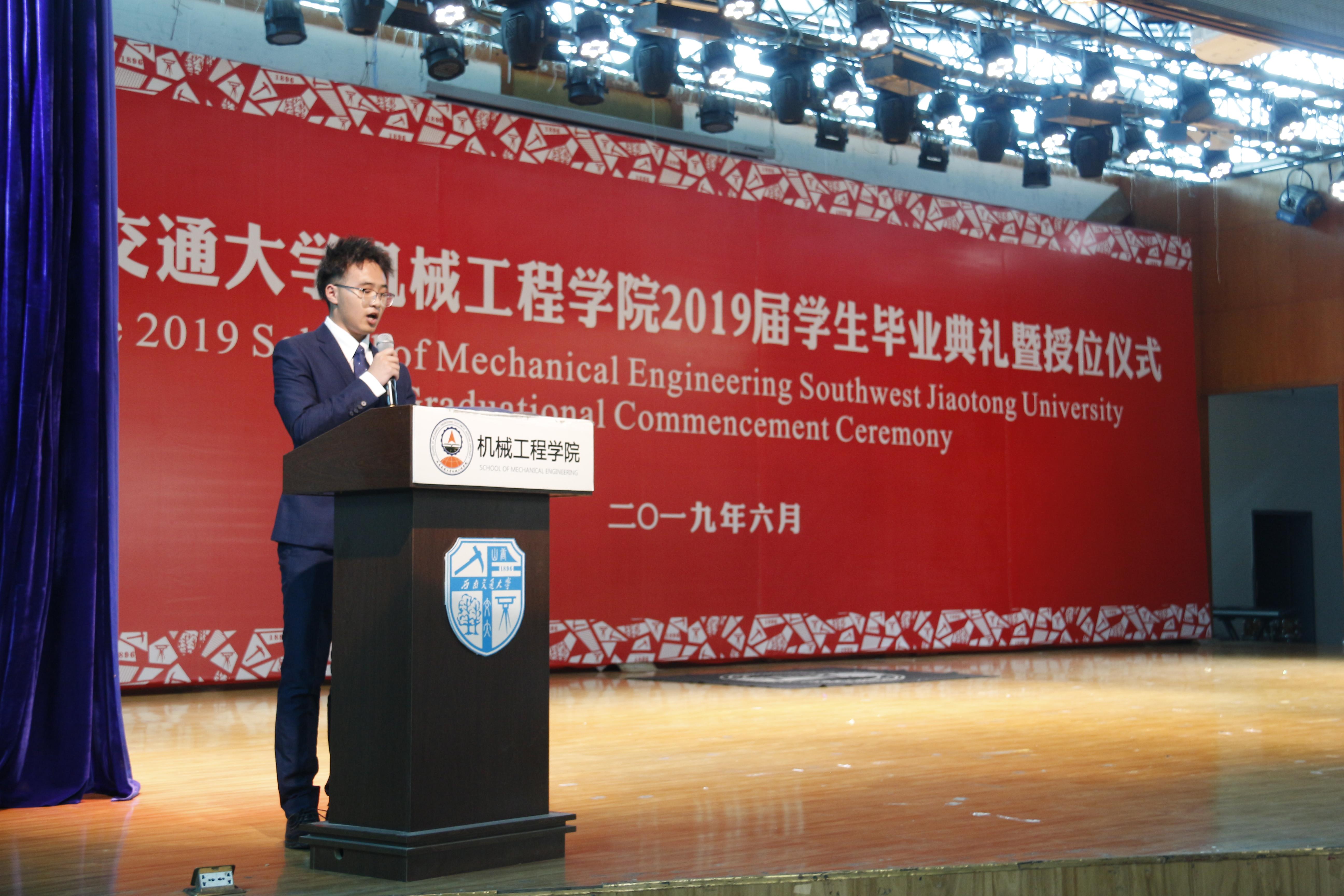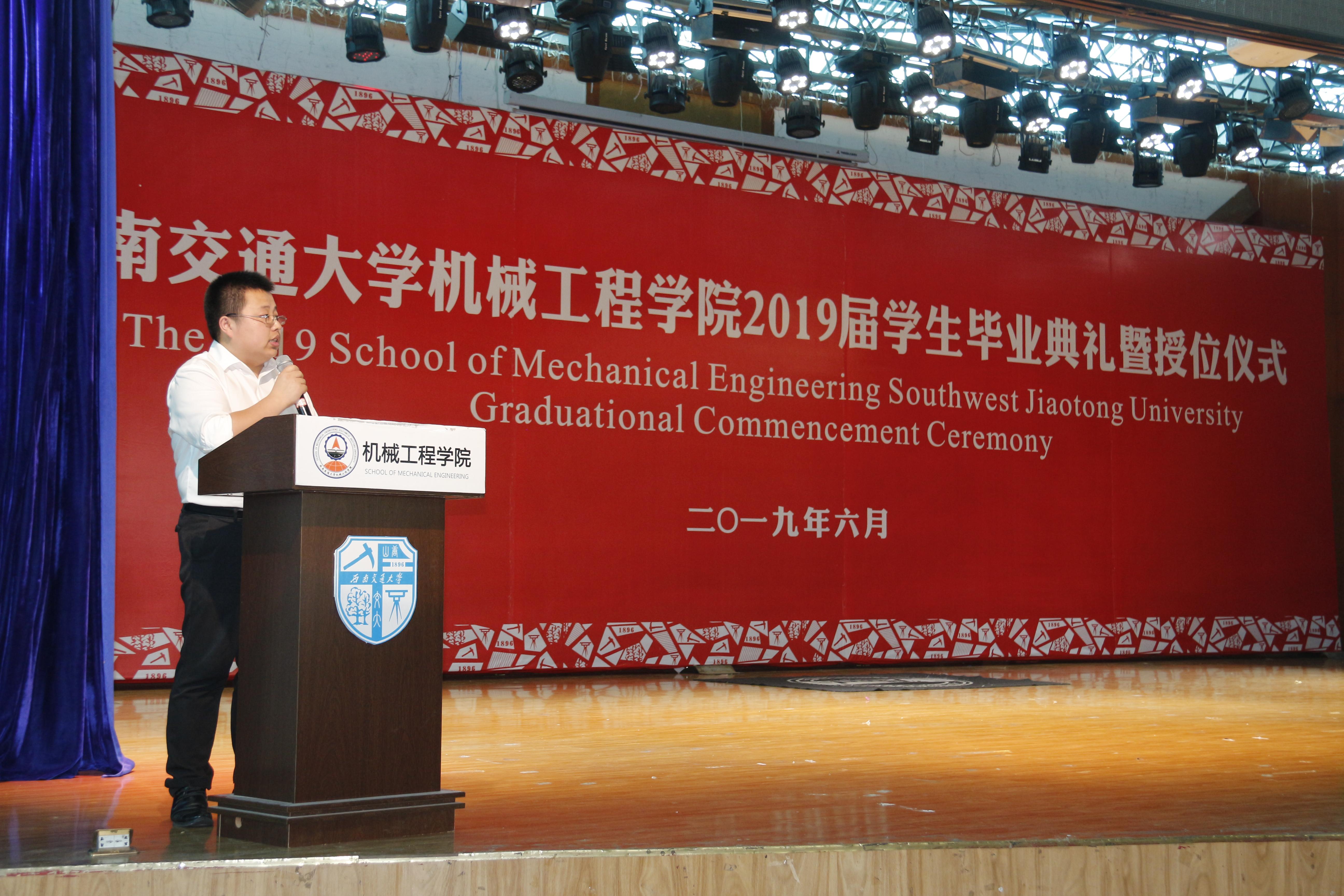 接下来,校学工部副部长、原学院党委副书记李毅为毕业生送上情深祝福,本科生舒柏瑞、研究生骆传宇两位同学作为毕业生代表发言,黄运华老师作为班导师和任课教师代表发言,杨怀银老师作为毕业生辅导员代表发言,2019届毕业生曹奥同学母亲张丽英女士作为家长代表发言。