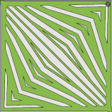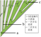 3.叶脉的选型以及初始模型的建立。叶脉类型有分叉状脉、掌状网脉、羽状网脉等。在众多叶脉中,由于分叉状脉中的银杏叶脉具有近似三角形轮廓,以其最长边对称可形成正方形轮廓;叶脉从叶柄分叉后呈放射状向外扩散,与双极板中反应气体进入流场的方式相同;且银杏叶片具有均匀的二叉分枝叶脉,无中脉,营养物质分配更均匀,流动阻力小。故作者选择银杏叶脉作为双极板流场的仿生类型,模仿其二叉分枝方式,建立了仿生银杏叶脉流场双极板的初始模型,称为模型1,其流道排布与结构如图3所示。