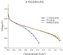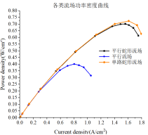 2.对比模型的建立与分析。本文建立了具有平行流场、蛇形流场、平行蛇形流场的双极板,将它们分别装配到PEMFC中进行仿真计算,得出如图2所示的极化曲线与功率密度曲线。