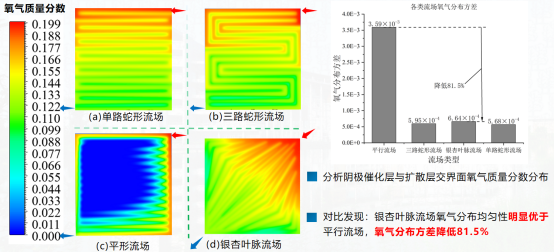 图6 仿生银杏叶脉流场与传统流场的氧气分布均匀性对比