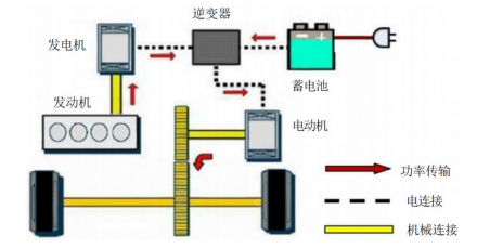 串联式PHEV的发动机与驱动轮之间没有机械上的连接,因此发动机能运行在其转速—转矩(功率)特性图上的任何工作点上,这样可以使发动机经常保持在稳定、高效、低污染的运转状态,使得有害排放气体控制在最低范围。串联式PHEV从总体结构上看,比较简单,易于控制,只有电动机的电力驱动系统,其特点更加趋近于电动汽车。发动机、电动机、发电机三大部件总成在电动汽车上,布置起来有较大的自由度,但各自的功率较大,外形较大,质量也较大,因此,在中小型汽车上布置有一定困难。串联式驱动系统只有一条能量提供路线,只要电力驱动系统不工作,车辆将不能驱动。另外,在发动机—发电机—电动机驱动系统中的热能—电能—机械能的能量转换过程中,能量损失比较大。从发动机发出的能量以机械能的形式从曲轴出发,并立即被发动机转换为电能,由于发电机的内阻和涡流将会产生能量损失(效率约为90%~95%)。电能随后又被电动机转变为机械能,在电动机和控制器中能量又进一步损失,平均效率约为80%~85%。由于发动机的能量经两次转换,能量转换的综合效率要比内燃机汽车低,因此串联式PHEV较适合在大型客车上使用,而不适合用于小型普通乘用汽车。