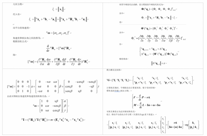 完成了机构的正逆运动学计算和机构的逆动力学计算,普遍基于最小二乘法。期间完成了对欧拉角-角速度转换的推导,对惯性张量的坐标变换的推导等。在正运动学计算方面采用了牛顿拉夫逊迭代法。