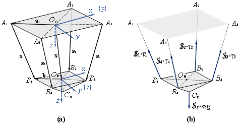 图3 机构局部放大示意图 图4 (a)机构几何矢量定义 (b)动平台受力分析