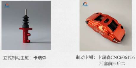 在大学生电动方程式赛车制动系统设计中,选择卡瑞森CNC6061T6制动卡钳和卡瑞森立式制动主缸(活塞前四后二)是综合多方面因素的结果。卡钳的铝合金材质经CNC加工,强度高且轻量化,能在保障制动稳定性的同时减轻车重,提升赛车性能。其合理结构可有效传递制动力。而制动主缸前四后二的活塞布局,能精准分配前后轮制动力,提高制动效率,增强赛车制动时的稳定性与操控性。立式设计节省空间,更适配赛车紧凑结构,便于安装维护。