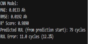 在设定的预测起点开始预测,拟合程度较高,MAE,RMSE较小,R²接近1,说明拟合程度高,同时计算出来的RUL误差只有1.6%,说明模型的可靠度较高。