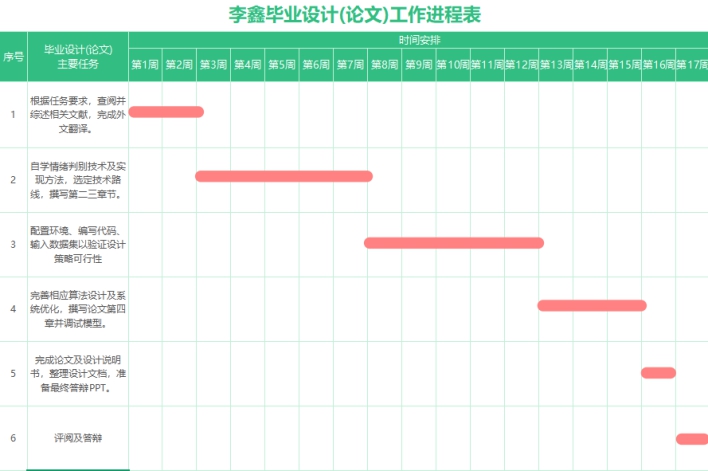 本人目前按上述任务分解的整体安排顺利进行,目前已完成前三部分任务并已开始第四部分工作。有信心按期完成本人毕业设计。