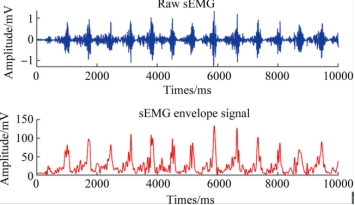 (1)下肢表面肌电信号sEMG:肌电图主要讨论的是骨骼肌的运动过程,在肌肉受到刺激的同时,会产生一连串的动作电位。sEMG就是在相应肌肉表面通过电极,从而记录下一连串的MUAP电信号,透过肌电图便可以得知周围神经、神经元、神经肌肉接头及肌肉本身的功能状态。