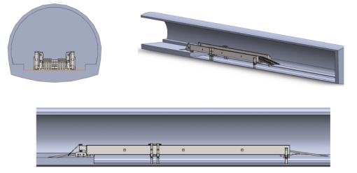 (2)基于时速350kph高速铁路隧道的断面图,完成隧道的三维建模。基于隧道的断面尺寸,确定栈桥的结构参数,并完成栈桥各结构的设计与三维建模。通过栈桥的装配体模型和隧道三维模型,进一步了解栈桥的工作过程,确定有限元仿真分析的研究思路。