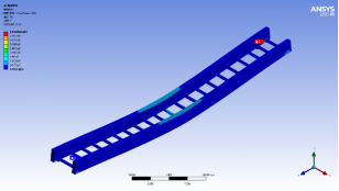 分析求解结果,确定栈桥在当前荷载状态下的变形范围和应力范围,并找到变形最大值即其位置和应力奇异值及其位置,对比相关文献资料评估有限元分析结果。更改载荷施加的位置,重新对栈桥的效应力与变形求解,对比载荷施加在不同位置时主梁的应力及变形情况。