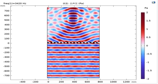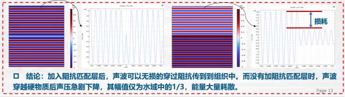 仿真场景为0.1MPa平面波从下向上入射,不考虑传热问题。加入阻抗匹配层后,声波可以无损的穿过阻抗传到到组织中。而没有加阻抗匹配层时,声波穿越硬物质后声压急剧下降,其幅值仅为水域中的1/3,能量大量耗散。