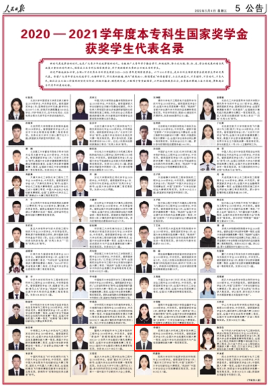 On May 4, People’s Daily unveiled the laureate list of national scholarship for undergraduates, which includes Li Xiaoyu, an undergraduate in the class of 2022 of the School of Mechanical Engineering, Southwest Jiaotong University.